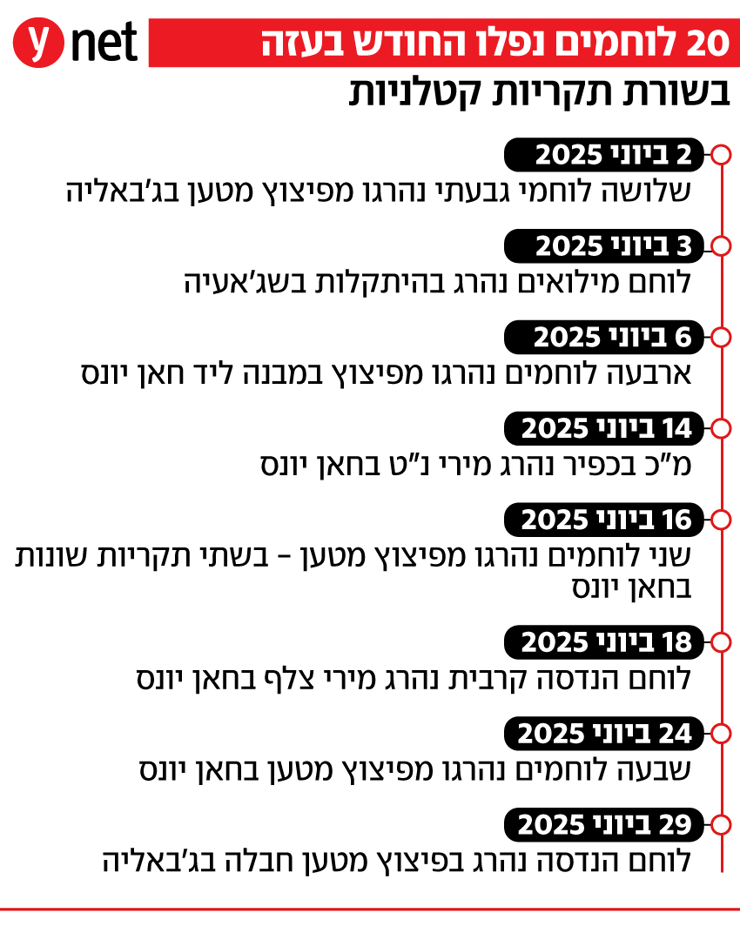 מתחילת חודש יוני נפלו כאמור בקרבות ברצועת עזה 20 לוחמי צה"ל. הם נפלו בשורה של תקריות קטלניות, שרובן המכריע לא כללו היתקלות עם מחבלים. 15 חללי צה"ל נפלו החודש בקרבות בחאן יונס או סמוך לעיר הדרומית, ארבעה נהרגו בקרבות בג'באליה ואחד נפל בהיתקלות בשג'אעייה. אלו 20 חללי צה"ל שנפלו במהלך החודש בשורת תקריות קטלניות: