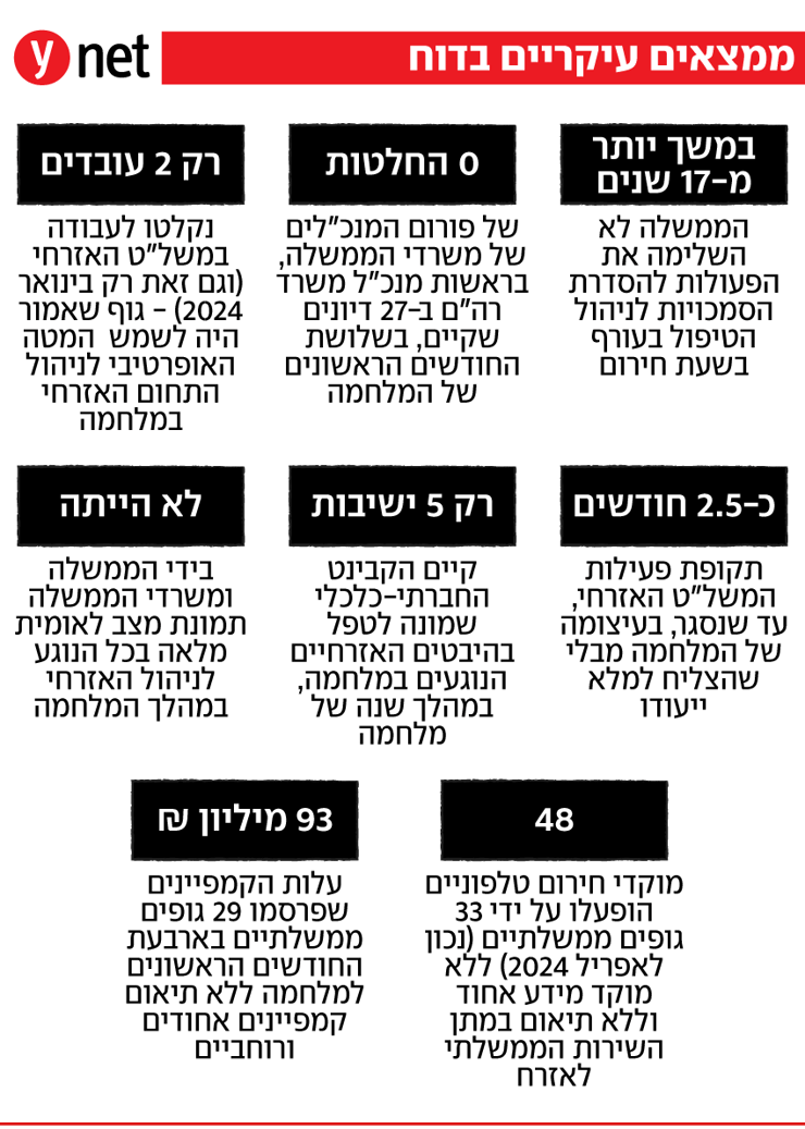את מחיר המחדל המתמשך המפורט שילמו כמובן תושבי ישראל, שנזקקו נואשות לסיוע, ובדוח נקבע שההחלטות שקיבלה הממשלה לאחר פרוץ המלחמה לא השיגו את תכליתן, ולמעשה יישומן התפוגג כתוצאה מהניסיון הכושל להעמיד מבנה תפקודי ללא היערכות מוקדמת נאותה.