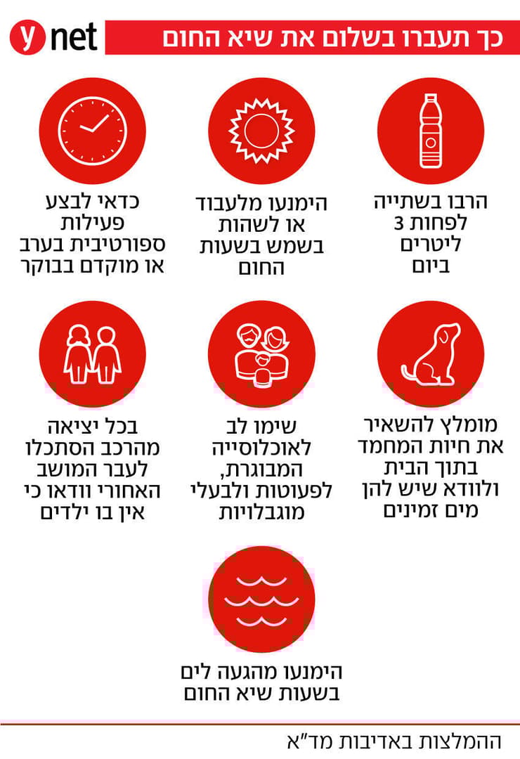 מדובר בתופעות העיקריות בלבד, אך ייתכנו סכנות נוספות, ולכן יש לנקוט במשנה זהירות. הקלת מה בעומס החום, כאמור, צפויה רק ביום שישי, אך עדיין יהיה חם ויבש - ואף הביל במישור החוף.