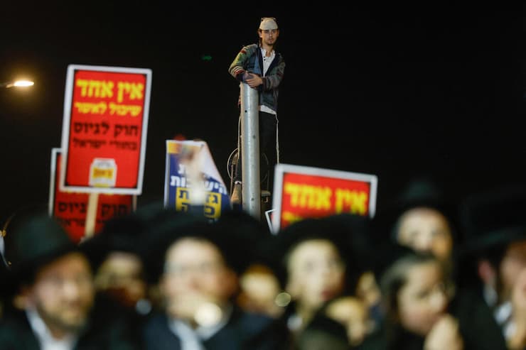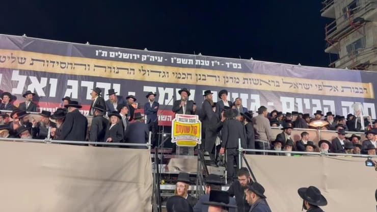 אלפי חרדים הפגינו הערב (שלישי) באזור רחוב בר אילן בירושלים, בעצרת נגד גיוס לצה"ל שבה משתתפים גם רבנים. זאת, בזמן שחוק הפטור מגיוס שמקדמת הממשלה עדיין לא אושר בוועדת החוץ והביטחון. כמו ב"קבלת הפנים" שנערכה שלשום בבני ברק לבחורי ישיבה ששוחררו מהכלא הצבאי, אז השווה אחד הרבנים את צה"ל ואת המובילים לגיוס חרדים לצורר הנאצי אדולף היטלר - גם הערב אחד הרבנים השווה בין גיוס לצה"ל לשואה.