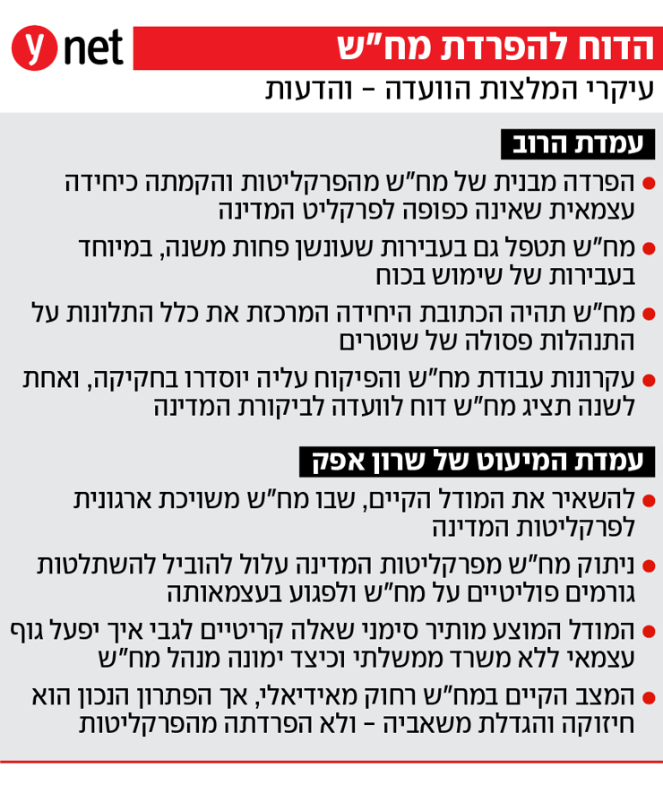 דוח ועדה ציבורית, שיוגש מחר (שני) לשר המשפטים יריב לוין, מציע להעביר את המחלקה לחקירות שוטרים הכפופה היום לפרקליטות המדינה לגוף עצמאי. ההמלצה הזו התקבלה בניגוד לעמדת כל צמרת משרד המשפטים, ובראשם חבר הוועדה שרון אפק, המשנה הבכיר ליועמ"שית, פרקליט המדינה עמית איסמן וההערכה היא שגם היועצת המשפטית לממשלה. ל-ynet נודע כי בדעת המיעוט של אפק נכתב כי "המודל המוצע עלול להוביל ללחצים פוליטיים".