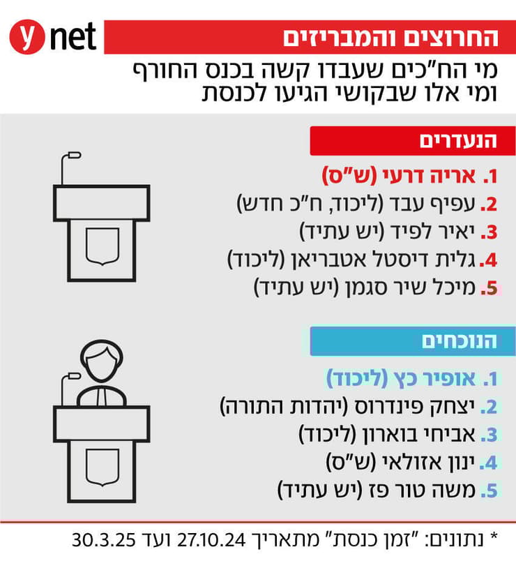 בראש הרשימה ההפוכה, שמציגה את מי שהגיע הכי פחות לכנסת, נמצא כבר תקופה ארוכה יו"ר ש"ס, ח"כ אריה דרעי. עם הקמת הממשלה דרעי היה אמור להתמנות לשר, אלא שלנוכח עברו הפלילי בג"ץ פסל את המינוי. ובכל זאת, נראה שבקואליציה לא מצפים שהוא יתנהל כמו ח"כ מן המניין והוא נעדר מהצבעות רבות, אפילו לא נכח בשבוע שעבר בהצבעות על תקציב המדינה. בסך הכול הוא נכח בכנסת 50 שעות.