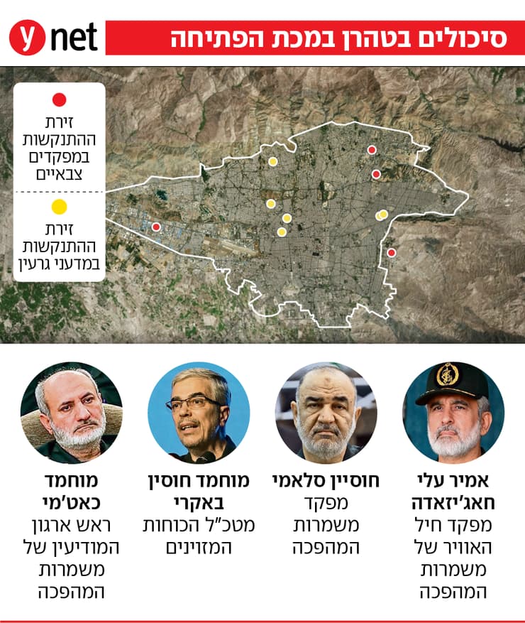 13:30 - צה"ל מודיע על עוד ארבעה סיכולים של בכירים, בהם ראש ארגון המודיעין של משמרות המהפכה מוחמד כאט'מי וסגנו. כאט'מי נכנס לתפקיד "ראש אמ"ן" של משמרות המהפכה ב־2022 והיה אחראי בין היתר על סיכול, ריגול ופגיעה במתנגדי המשטר האיראני מאיראן. בנוסף, הוא וסגנו עסקו לא מעט בגיבוש המודיעין כנגד ישראל. צימט: "ארגון המודיעין של משמרות המהפכה הוא מעין שילוב של מוסד ושב"כ. יש לו תחומי אחריות של סיכול איומים פנימיים, מתנגדי משטר וכדומה, אבל גם אחריות לתמיכה בהוצאה לפועל של טרור מחוץ לגבולות איראן, למשל נגד מטרות ישראליות או יהודיות".