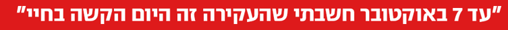 צורית לא תשכח את הרגע שבו פתחה את הטלפון ונכנסה לקבוצת ראשי צח"י של אשכול. "הקבוצה הייתה מוצפת בהודעות: 'מחבלים ביישוב', 'מחבלים בבארי, הם עוברים מבית לבית', 'מחבלים בניר עוז', 'איפה הצבא???' ראש צח"י של ניר יצחק פשוט כתבה: 'הצילו'. כשראש צח"י של בארי כתבה 'כנראה שיש לנו חטופים', חשבתי שהיא סתם היסטרית. בכל פעם שפנחס הרבש"ץ שלנו נכנס לחמ"ל, הוא בישר על עוד מישהו שנהרג באשכול. פתחתי פתק בטלפון והתחלתי לכתוב את שמות ההרוגים שאני מכירה. באותו יום נהרגו ונרצחו 28 אנשים שהכרתי באופן אישי, בהם שני חברי כיתת הכוננות של שלומית. תמיד אמרתי שיום העקירה מנצרים היה היום הכי קשה בחיים שלי, אבל היום אני יכולה להגיד: 7 באוקטובר היה היום הכי קשה".