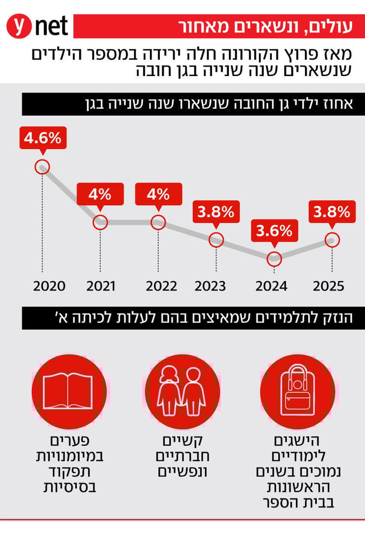 ממשרד החינוך נמסר בתגובה: ״ההחלטה על השארת ילד שנה נוספת בגן מתקבלת אך ורק משיקולים מקצועיים ותוך בחינת טובתו האישית של כל תלמיד. הטענה בדבר שיקולי חיסכון היא חסרת יסוד – המדיניות נקבעת משיקולים חינוכיים והתפתחותיים בלבד. במקרים שבהם עולה צורך ייחודי, מתקיים בירור מקצועי בשיח עם ההורים, ועל בסיסו מתקבלת ההחלטה להשאיר שנה נוספת בגן. המשרד מכיר בכך שלאור תקופת המלחמה ניכרים קשיים בקרב כלל שכבות הגיל, ולשם כך מופעלות תוכניות חוסן שונות וליווי פדגוגי המסייעות בהתמודדות הרגשית והלימודית. עם זאת, אין מדובר בתופעה ייחודית למעבר מהגן לכיתה א'״.