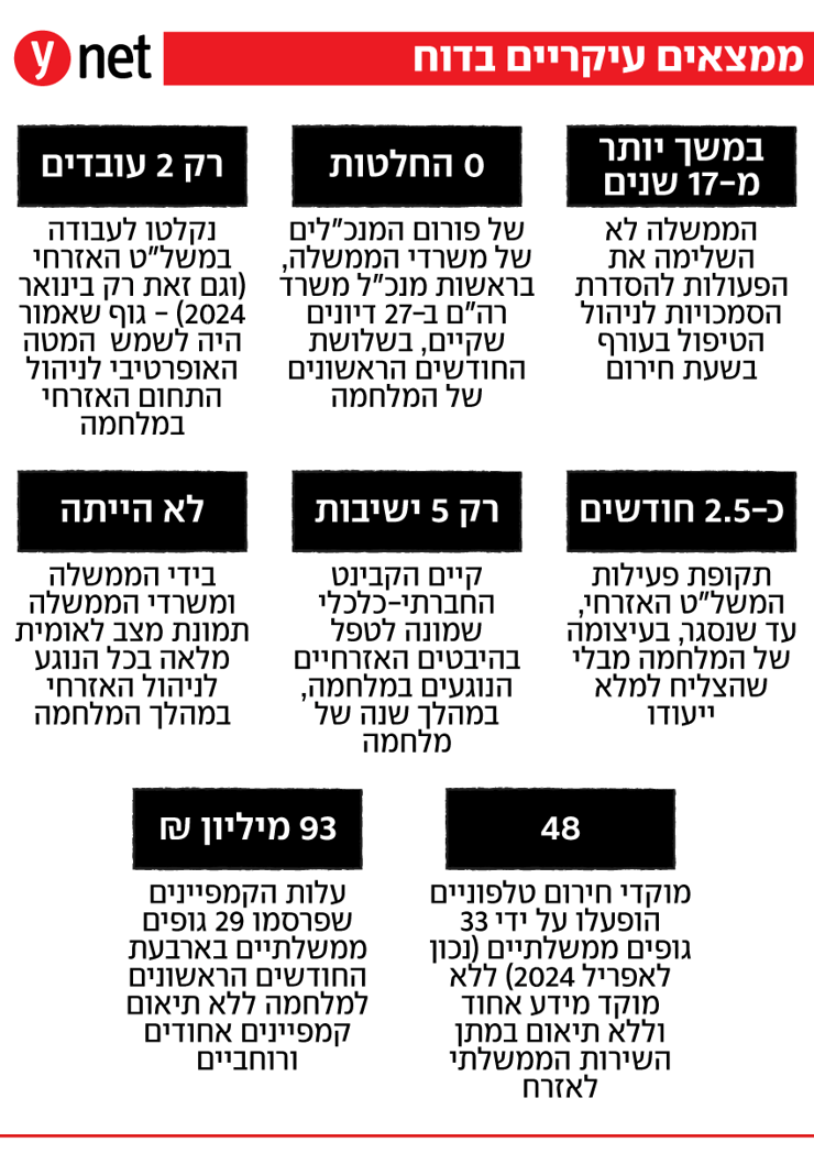 מאחורי הדוח הקשה שפרסם אתמול (רביעי) מבקר המדינה עומדים מאות אלפי תושבים שחווים על בשרם באופן יומיומי את הטיפול הלקוי בעורף, בזמן המלחמה. הם פונו, הזדקקו לטיפול נפשי מסיבות שונות או חוו פגיעה כלכלית בעסק ‑ אבל המענה התעכב והתעכב. ובמקום שבו לא הייתה מדינה, היו אנשים שניסו למלא את החלל.