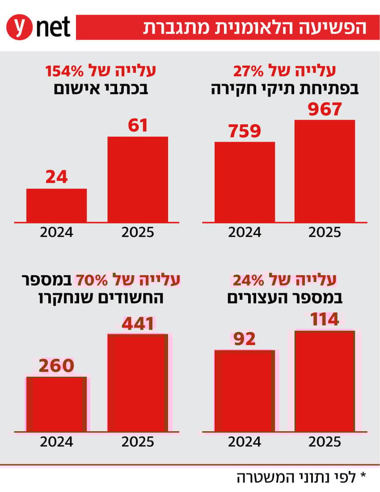 השנה נפתחו 967 תיקים בנושא פשיעה לאומנית, לעומת 759 בשנה שעברה. הוגשו 61 כתבי אישום לעומת 24 אשתקד, ונעצרו 119 חשודים לעומת 92 בשנה הקודמת. בנוסף, השנה נחקרו עד כה 441 חשודים לעומת 260 אשתקד. "אנחנו לא מחכים לאירוע הבא", אומרים במחוז, "אנחנו מזהים, חוקרים, פועלים ומגיעים לפורעי החוק מראש".