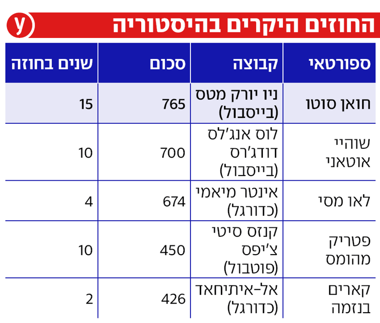 החוזה החדש של סוטו כולל שכר שנתי של 51 מיליון דולר ובצירוף בונוסים שונים יכול להגיע אף ל-800 מיליון (!) בסיום התקופה. מה שכן, למטס ישנה אפשרות לחתוך את השחקן, במידה ויאכזב בתום עונת 2028/29. אגב, היאנקיז - כך מדווחים בארה"ב - הגישה לסוטו הצעה של 760 מיליון דולר ל-16 שנה, אך הוא דחה אותה על הסף. צרות של עשירים.