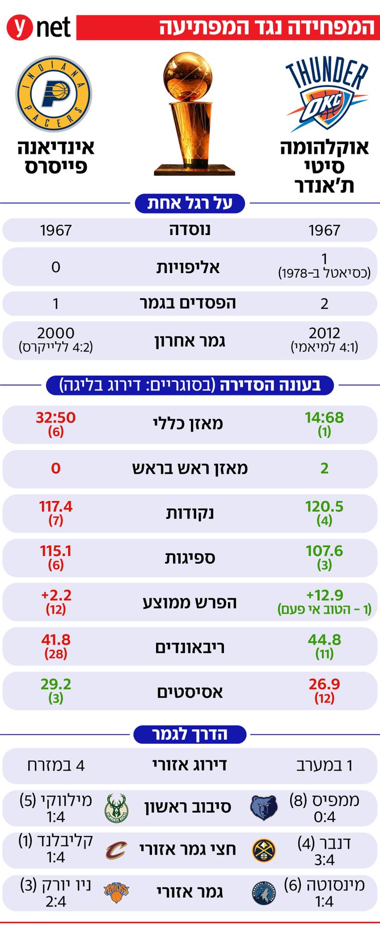 כשהפייסרס יעלו הלילה (בין חמישי לשישי, 03:30) למשחק הראשון בסדרת גמר הפלייאוף נגד אוקלהומה סיטי ת'אנדר, הם ייקחו איתם הרבה יותר מאשר את תקוות העיר אינדיאנפוליס. בניגוד למרבית קבוצות הליגה, הפייסרס הם לא קבוצה של עיר, הם קבוצה של מדינה שקוראת לעצמה "מדינת הכדורסל", ויש לה את כל הקבלות הדרושות כדי להצדיק את התואר הזה. חוץ מאליפות NBA.