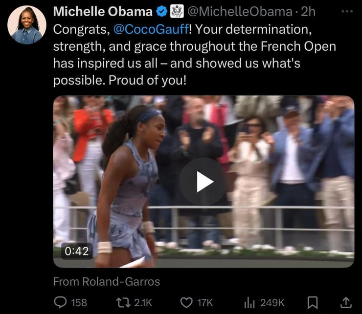 גם מייסדת סבב ה-WTA בילי ג'ין קינג לא נותרה אדישה: "מדהים!", כתבה ברשתות החברתיות מיד לאחר הזכייה. אל רשימת המברכים הצטרף גם קרלוס אלקראס, שיתמודד מחר (ראשון) בעצמו בגמר הגברים מול יאניק סינר, וצייץ: "ברכות, קוקו גוף". סצנה מעניינת נרשמה עם סיום המשחק, כשגוף ניגשה קודם לבמאי ספייק לי וחיבקה אותו – עוד לפני שחיבקה את הוריה.