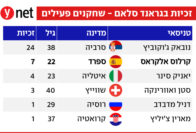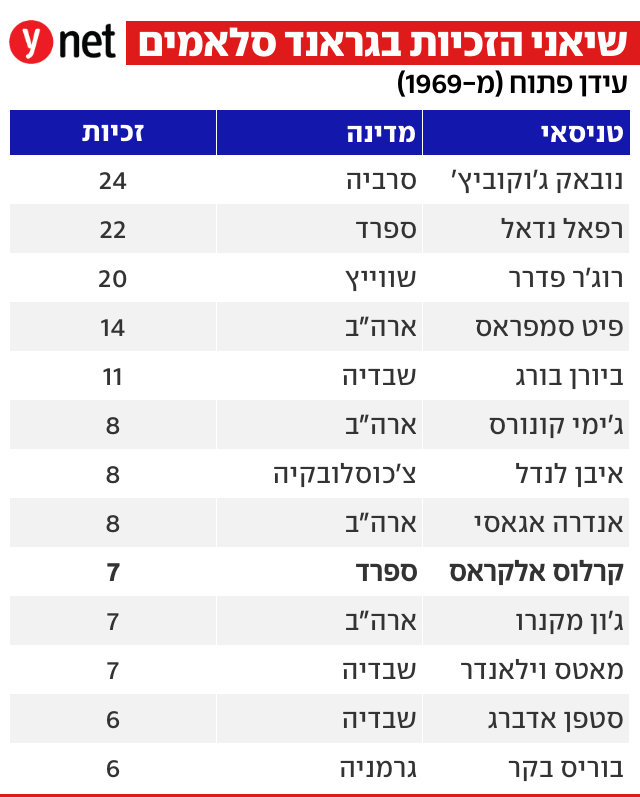 היסטוריה במלבורן: קרלוס אלקראס בן ה-22 הפך היום (ראשון) לטניסאי הצעיר ביותר שמשלים זכייה בכל ארבעת הגראנד סלאמים, כשניצח את נובאק ג'וקוביץ' 6:2, 2:6, 3:6, 5:7 בגמר אליפות אוסטרליה.