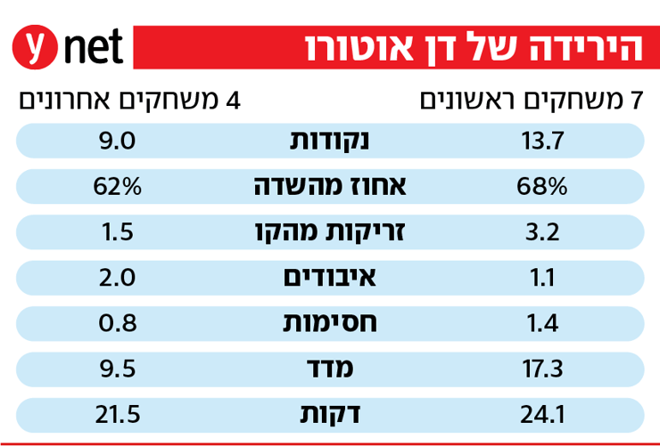 דן אוטורו פתח את העונה בהפועל תל אביב בסערה. היו לכך כמה סיבות. המרכזית היא שג'ונתן מוטלי לא היה בעניינים בחודש-חודשיים הראשונים, ומי שהגיע כביכול כסנטר המחליף שלו, ניצל את ההזדמנות והפך לגבוה הפותח. אוטורו גיבה את הקרדיט שקיבל במספרים: ב-7 מחזורי היורוליג הראשונים הוא קלע 13.7 נקודות ב-68% מהשדה לצד 1.4 חסימות ו-17.4 במדד ב-24.1 דקות. ב-4 המחזורים האחרונים ירד ל-9 נקודות, 62% מהשדה, 0.8 חסימות ומדד 9.5 ב-21.5 דקות.