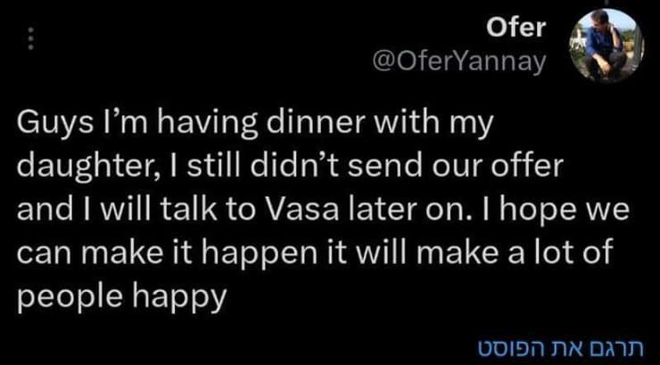 עסקה גדולה בדרך? בעלי הפועל ת"א עופר ינאי כתב הערב (שלישי) בחשבון ה-X שלו: "אני מתכוון לדבר עם ואסיליה מיציץ' מאוחר יותר הערב - נקווה שנשמח הרבה אנשים".