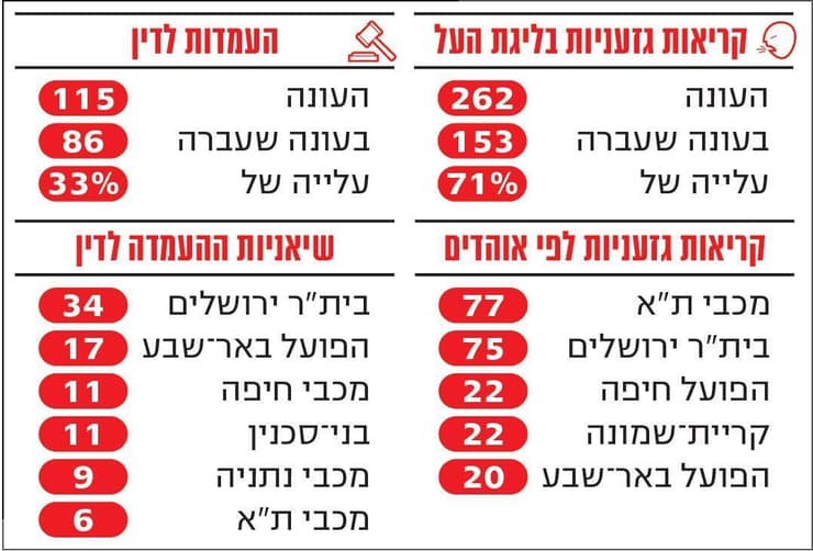 במקום הראשון ניצבים אוהדי מכבי ת"א, עם 77 קריאות גזעניות שתועדו - עלייה של 60%, ואחריהם אוהדי בית"ר ירושלים עם 75. את המקום השלישי חולקות הפועל חיפה וקריית־שמונה (22). בקרב אוהדי הפועל באר־שבע נרשמו 20 קריאות גזעניות, לעומת אפס בעונה שעברה.