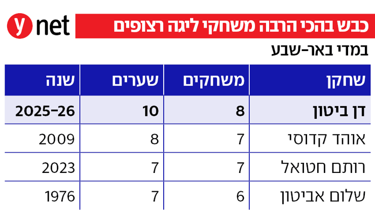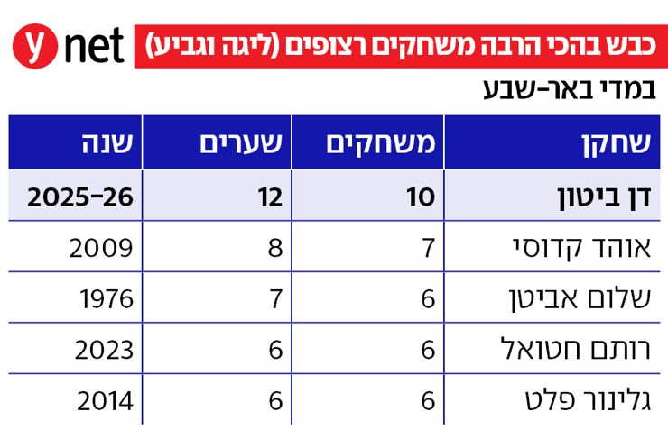 דן ביטון, שכבש אתמול שלושער עבור הדרומיים, נכנס לספרי ההיסטוריה של המועדון, תוך שהוא גם משיג נקודת ציון אישית בקריירה. מבחינה אישית, זאת הפעם הראשונה שהוא כובש שלושה שערים במשחק אחד. מבחינה קבוצתית, ביטון הפך אתמול לשחקן הראשון בתולדות באר-שבע שמבקיע בשמונה משחקי ליגה רצופים (כולל חמשת המחזורים האחרונים בעונה שעברה).