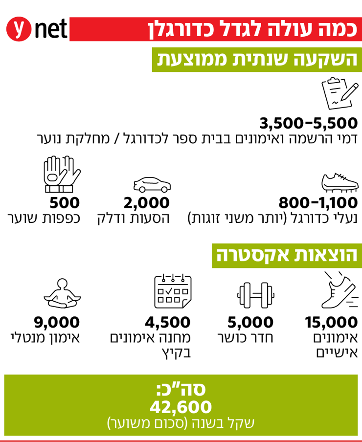 העלויות הכלכליות הכרוכות בגידול כדורגלן צעיר הן נושא משמעותי ומורכב להורים, והן מתחלקות למספר תחומים. תחילה, יש את ההוצאה הבסיסית על רישום למועדונים, שנעה בין 3,500 ל-5,500 שקל בשנה, תלוי בגיל הילד ובמועדון. אך מדובר בהוצאה ראשונית בלבד, שכן עבור רוב השחקנים הצעירים העלויות לא מסתכמות בכך. נעלי כדורגל איכותיות יכולות לעלות 1,000 שקל ומעלה, והן נדרשות להחלפה כל כמה חודשים, תלוי בשחיקה ובגידול של הילד. בנוסף, עבור שוערים, יש את העלות של כפפות כדורגל, שמחירן נע בין 400 ל-1,500 שקל לזוג, וגם הן צריכות להיות מוחלפות כל מספר חודשים.