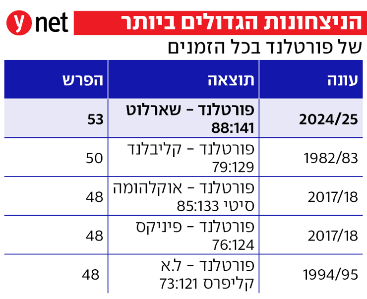 אחרי ארבעה הפסדים רצופים, דני אבדיה ופורטלנד חזרו לפנות בוקר (בין שבת לראשון) למסלול הניצחונות - ועשו זאת בענק. 88:141 ביתי יוצא דופן על שארלוט - הניצחון בפער הגבוה ביותר בתולדות המועדון.