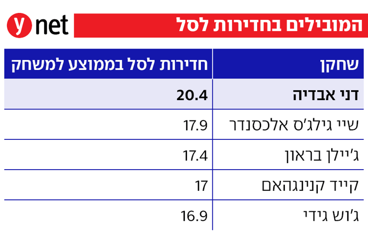 כל זה קורה אחרי שבשנים הראשונות שלו בליגה אבדיה דווקא התקשה לסיים חדירות בסלים, אבל השנה הוא מוכיח - משחק אחר משחק - שהוא כמעט בלתי ניתן לעצירה כשהוא בדרך לסל. עשירית הכוס הריקה - גם באיבודים מחדירות אבדיה ראשון ב-NBA.