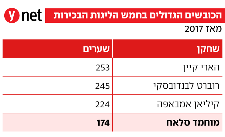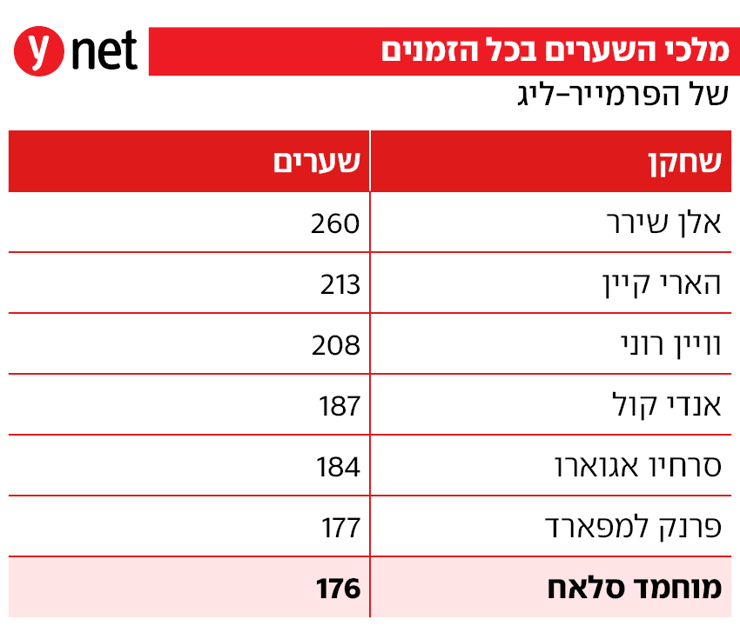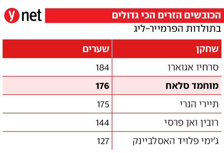 סלאח בן ה-32 כבש את השער השני של מוליכת הטבלה ורשם ציון דרך מרשים למדי: לשחקן הכנף יש כעת 176 כיבושים בקריירה בפרמייר-ליג - ובכך עקף את אחת מאגדות ארסנל והכדורגל האירופי, תיירי הנרי. בכלל, סלאח טיפס למקום השני בטבלת מלך השערים הזר של הכדורגל האנגלי - רחוק שמונה שערים ממי שניצב בפסגה: סרחיו אגוארו (184).
