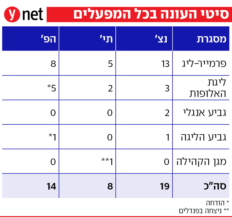על פרצופו של פפ גווארדיולה לאורך השנה ניתן כבר לכתוב מחקרים (וגם דוחות רפואיים, אם נזכרים בשריטות ובחבורות), אך גם מבטו המיואש של קווין דה־בריינה מלמד שהוא מבין בדיוק לאן הרכבת הזאת דוהרת – והתשובה היא לא לכיוון האור בקצה המנהרה. פיל פודן עוד צעיר מכדי להודות ללא מילים שהסיפור עומד להסתיים, אבל דווקא ההתרוצצות שלו כמו מעידה על האכזבה על כך שלא הצליח לשחזר את יכולתו מהעונה שעברה. גם מד הזחיחות של ארלינג הולאנד התאים את עצמו לסיטואציה, ועל ניית'ן אקה חבל להרחיב את הדיבור: העיניים שלו עדיין מחפשות את הגב של מוחמד סלאח.