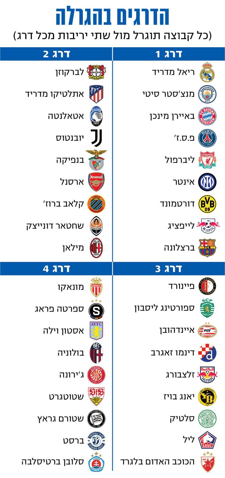הפתעות העונה הקודמת בחמש הליגות הבכירות - אסטון וילה (אנגליה), ג'ירונה (ספרד), שטוטגרט (גרמניה), ברסט (צרפת) ובולוניה (איטליה) שובצו כולן בדרג הרביעי. זוכת הליגה האירופית אטאלנטה שובצה בדרג השני, כמו גם סגניתה וזוכת הדאבל בגרמניה באייר לברקוזן.