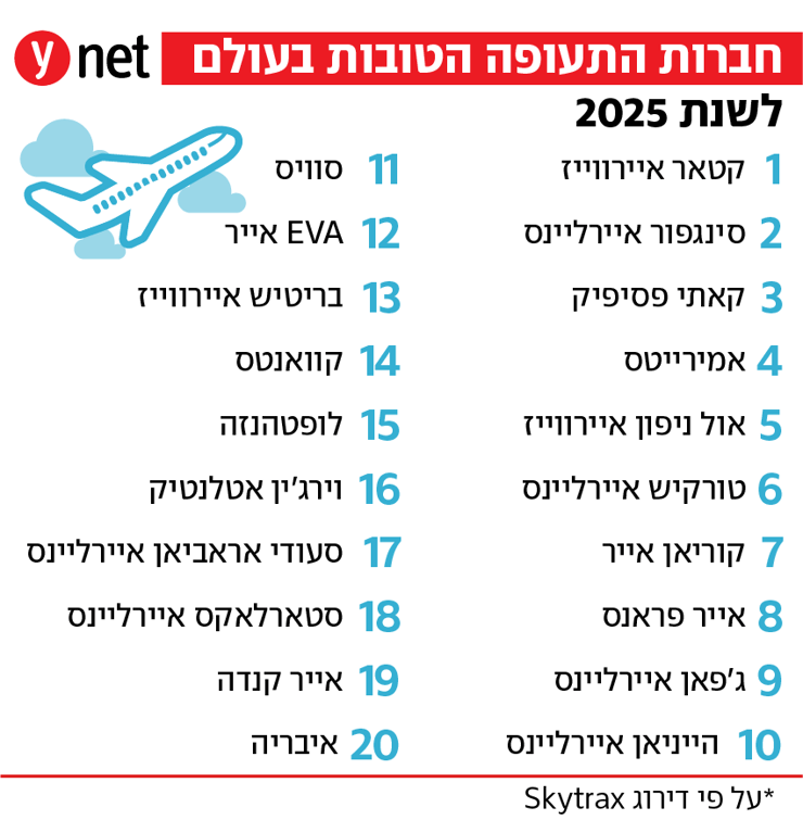 קטאר איירווייז זכתה במקום הראשון בדירוג חברות התעופה של חברת סקייטראקס (Skytrax) שנחשב ל"אוסקר של ענף התעופה". אל המקום השני הגיעה סינגפור איירליינס וקתאי פסיפיק קטפה את המקום השלישי. אל על, חברת התעופה הישראלית הגדולה ביותר, נמצאת גם הפעם מחוץ לרשימת 100 חברות התעופה הטובות בעולם של סקייטרקס.