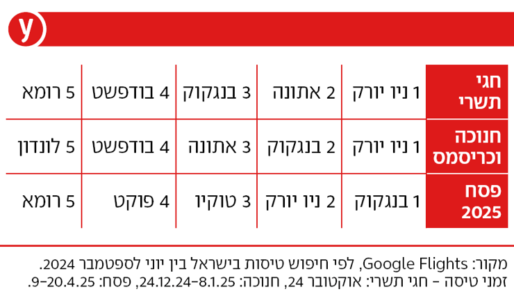 ברשימת היעדים המבוקשים לחופשות חגי תשרי, חנוכה ופסח: ניו יורק, בנגקוק, פוקט וטוקיו ממשיכות לככב כיעדים אהובים במיוחד. בגזרת היעדים הקרובים, לונדון נדחקת מהיעדים הפופולריים ביותר כשאתונה ורומא ממשיכות להתחזק על חשבונה.