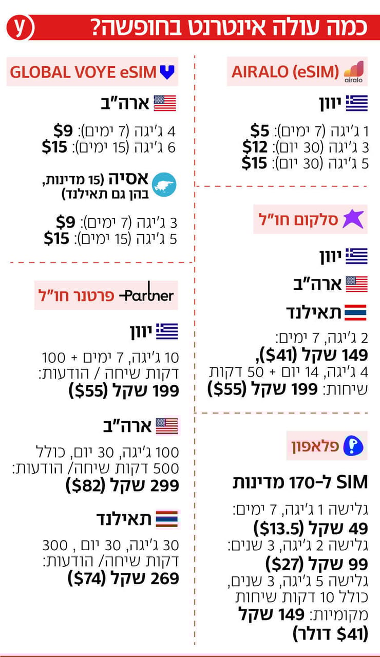 בהתחשב בעובדה שהרוב המוחלט בקרב הישראלים טס לתקופה של עד 7 ימים לצד מי שטסים ליעדים רחוקים יותר (ארה"ב, אסיה, מזרח רחוק) לתקופה של עד 14 ימים, הרי שחברות הסלולר בעיקר מוכרות חבילות גלישה ל-30 ימים עם חבילות גלישה מאוד גדולות של 50GB, בממוצע מחירים שנע בין 200 ל-300 שקל לחבילת גלישה (לאדם) – דבר שלא באמת תואם את הצורך של הלקוח.