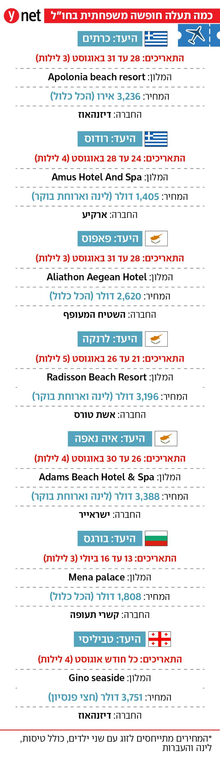 לדבריו, "היעדים המבוקשים ביותר ממשיכים להיות אלה הקרובים, ובראשם איי יוון וקפריסין, שמובילים בעקביות את רשימת היעדים הפופולריים. ביעדים הללו קיימת תחרות גבוהה, הן מצד חברות התעופה הישראליות והן מצד חברות זרות שמפעילות טיסות שכר – מה שתורם ליציבות המחירים. לצד זאת, העובדה שסיטונאיות התיירות רוכשות מבעוד מועד חדרים ביעדים הללו, מאפשרת לסגור חופשה במחירים נוחים, כשמחשבים גם את מחירי השהייה ביעד".