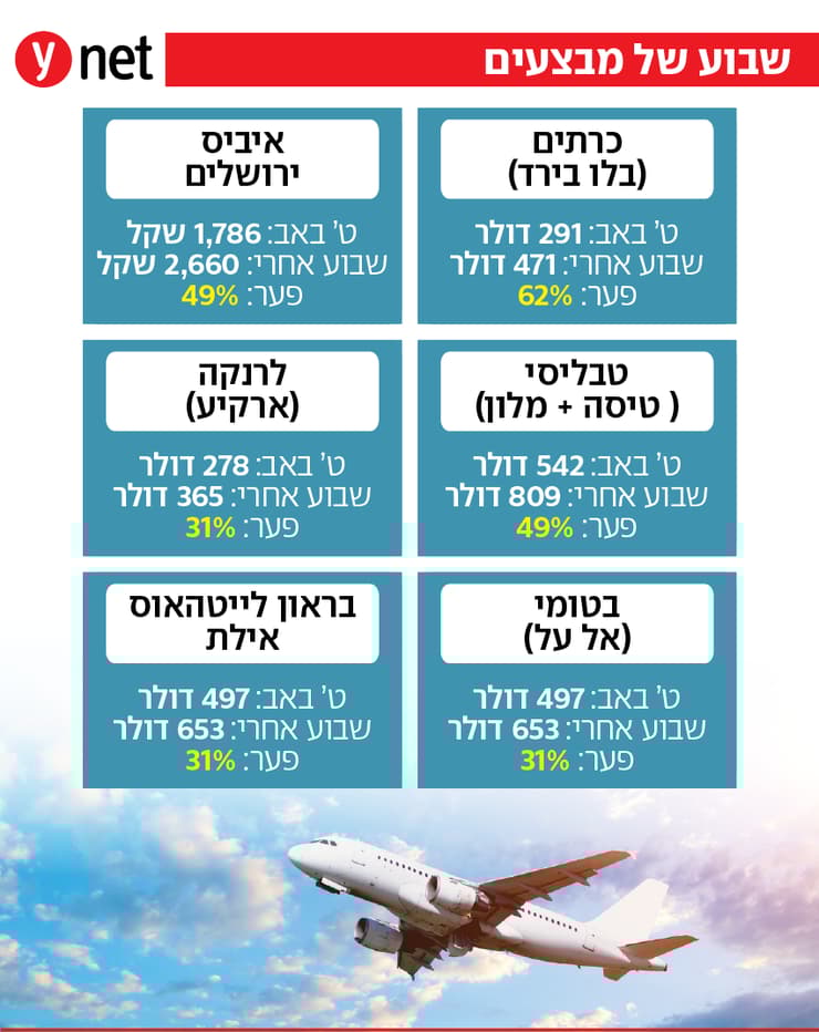 גם בחברות התעופה ניכרת המגמה. טיסה לטביליסי עם גיאורגיאן איירליינס בין 1 ל-4 באוגוסט מוצעת ב-435 דולר – בעוד שבוע לאחר מכן תעלה 477 דולר, ושבוע לפני תעלה 534 דולר – פער של עד 23%.