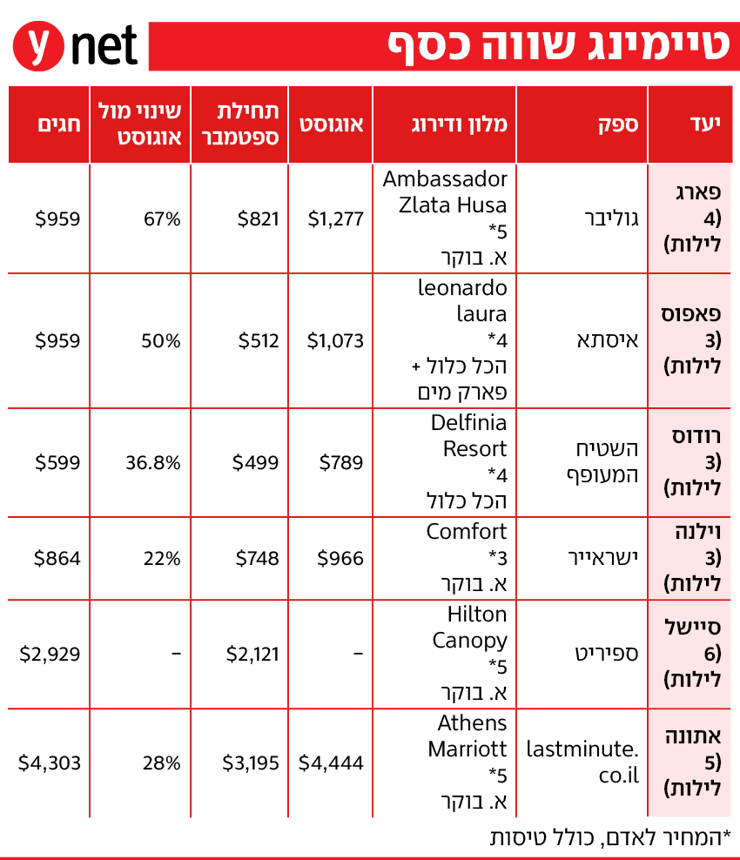 לצד החיסכון המשמעותי במחיר, תקופה זו מאופיינת לרוב גם במזג אוויר נעים, פחות עומסים ביעדים המרכזיים וחוויית חופשה רגועה יותר. מבדיקת ynet עולה כי החופשה יקרה בעשרות אחוזים בחגים ובקיץ מאשר בתחילת ספטמבר, בין 20% ועד 65%.