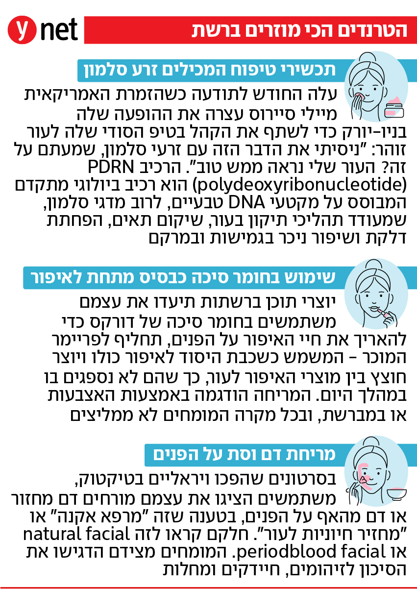 הדרך להשגת המטרה הנכספת עוברת בשינון מונחים כמו חומצה סליצילית, לקטית או היאלורונית, ובעיקר ברכישת עוד ועוד קרמים, סרומים, מסכות ותרסיסים. "בזמן האחרון אנחנו מבחינים בעיסוק בלתי פוסק בהשגת העור הכי צעיר, הכי קורן", מאפיינת נתלי יצחקוב, טרנדולוגית. "למעשה, אידיאל 'עור הזכוכית' לא מותיר מקום לשום דבר שמעיד שמדובר בעור של בן אדם אמיתי".