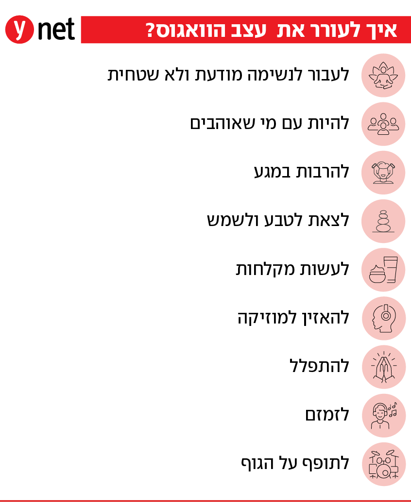 שאלת השאלות היא איך מעוררים את עצב הוואגוס וגורמים לו להפעיל את דוושת הרגיעה ולנטרל את דוושת הסטרס. יקיר מצביעה על פעולות נחוצות: "הדרך הכי מהירה זה לעבוד על הסדרת הנשימה בצורה מודעת דרך יוגה, מדיטציה, דמיון מודרך ועוד. מאוד עוזר גם לעשות אמבטיה חמה, לצאת להליכה בים או בטבע, להאזין למוזיקה מרגיעה, לזמזם ולבצע תנועות עדינות וחזרתיות של הגוף ממש כמו בתפילה, שהיא דרך הפעלה מטורפת של עצב הוואגוס", מדגישה יקיר ואומרת שיותר מכל הפעולות הללו ביחד, מה שהכי עוזר הם סביבה תומכת ומגע.