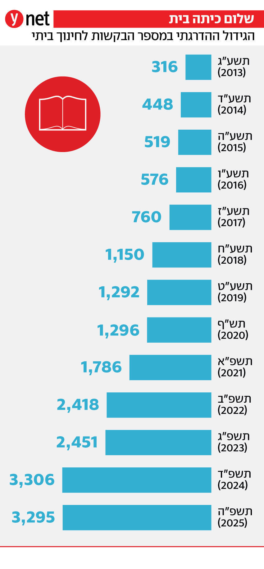 בשנת 2013 התקבלו במשרד החינוך רק 316 בקשות לפטור מחוק לימוד חובה ומעבר לחינוך ביתי. בשנת 2020, אז פרצה הקורונה, זינק המספר ל-1,420. המגפה כבר הרבה מאחורינו, אך לקראת שנת הלימודים הקרובה הוגשו כבר 3,082 בקשות שכאלה מצד הורים לילדים ובני נוער בגילים 3-18 (על הגידול ההדרגתי במספר הבקשות – ראו איור).