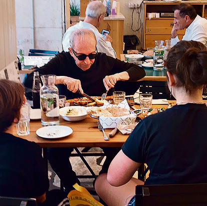 זה הכל בשבילכם: דני סנדרסון יצא עם שני נכדיו לצהריים בסגנון ישראלי באבן גבירול, שזה אומר שיפודים, חומוס־צ'יפס־סלט ופיתות כמובן.