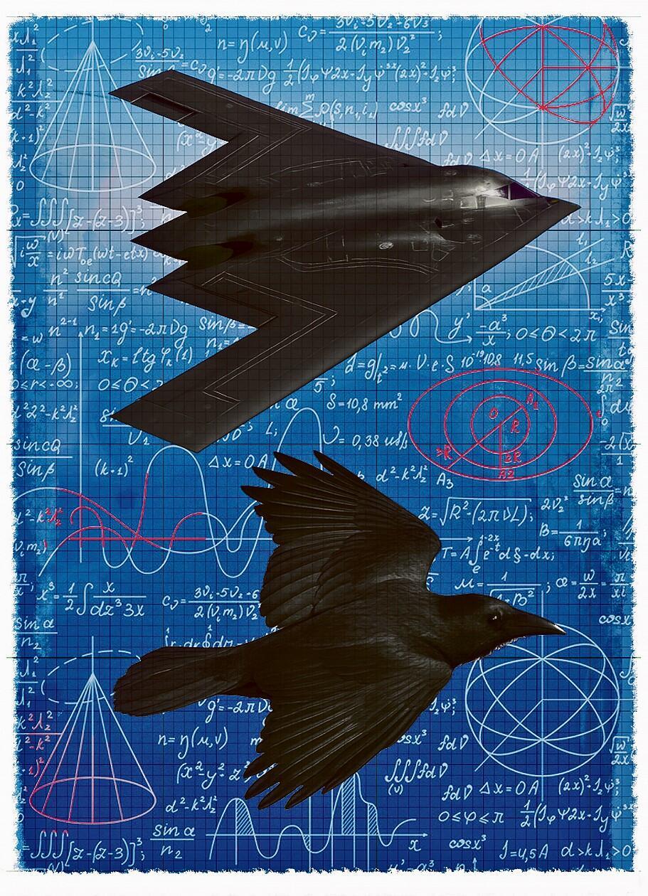 תכנונו מבוסס על עקרונות תעופה של ציפורים דואות גדולות כמו האלבטרוס והדאה: כנפיים פרוסות, גוף שטוח, תנועה מתמשכת וחרישית באוויר. בדומה לבעלי כנף נטולי זנב מובחן, דוגמת הסיס והסנונית, גם המפציץ החמקן נטול זנב, מה שמקנה לו פרופיל אווירודינמי חלק ויכולת להיטמע בזרם האוויר. בדומה לעשים ליליים, שפיתחו יכולת לפזר גלי קול ולהתחמק מציד באמצעות הסוואה אקוסטית, גופו המתכתי ספוג בחומרים מסיטים גלי מכ"ם.