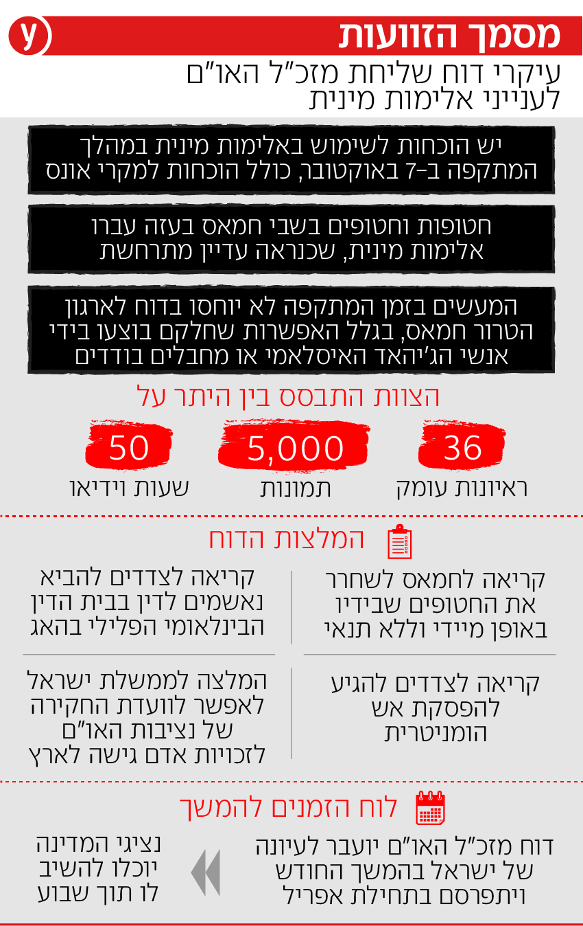 שורת מקרי אונס ב־7 באוקטובר ופגיעות מיניות בחטופות וחטופים בשבי חמאס הם רק חלק מהתיאורים הקשים שמופיעים בדוח האו"ם שפורסם אמש. ארגוני נשים בעולם, וגם ארגון הנשים של האו"ם - נמנעו במשך חודשים מלגנות את הזוועות שתוארו בעדויות מהשבת השחורה - ואמש הגיע המסמך הרשמי שמאמת את אותן העדויות. דוח שליחת מזכ"ל האו"ם מציג הוכחות לכך שבמהלך מתקפת מחבלי חמאס ב־7 באוקטובר נעשה שימוש באלימות מינית ואונס.