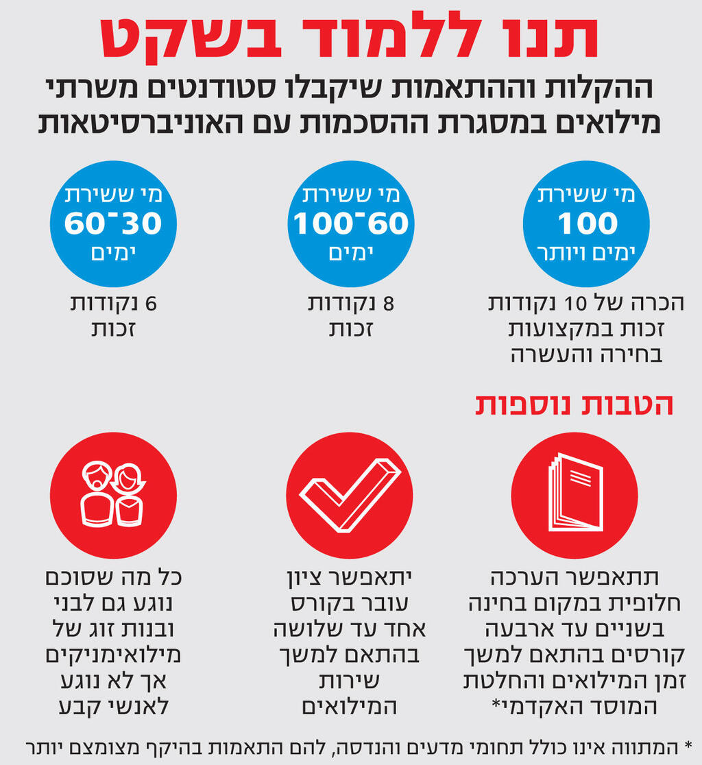 ההסכמות אמורות לקבל את אישור המועצה להשכלה גבוהה ואם תאשר אותן הסטודנטים יקבלו סיוע והתאמות בלי צורך בחקיקה. בין היתר הוסכם על מדרגות לפי מספר ימי המילואים. כך, למשל, סטודנטים ששירתו עד 60 ימי מילואים יהיו זכאים להכרה בשירות בערך של שש נקודות זכות, הערכה חלופית של שני קורסים ועובר בינארי בקורס אחד. נקבעו עוד הקלות לאלו ששירתו בין 60 ל־100 ימים ומדרגה נוספת למשרתים מעל 100 ימים.