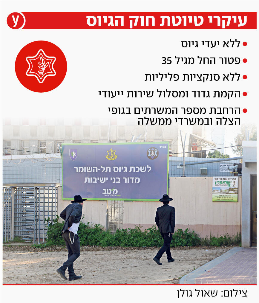 טיוטת ההחלטה בנוגע לחוק הגיוס נחשפה השבוע לראשונה, בפגישה סגורה שבה לקחו חלק שר הביטחון יואב גלנט, יו״ר המחנה הממלכתי בני גנץ ויו״ר ש״ס אריה דרעי, יחד עם נציגים מטעמם. תוכנה של הפגישה לא פורסם, אולם לידיעות אחרונות ו–ynet נודע כי זו הטיוטה שעלתה לדיון בניסיון להשיג הסכמות.