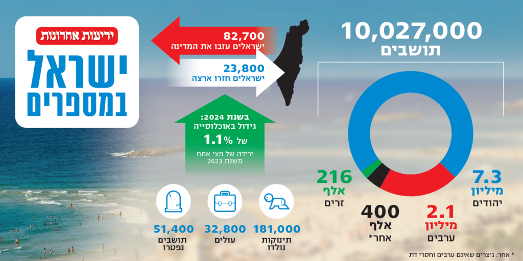 החדשות הטובות הן שאוכלוסיית ישראל חצתה בשבועות האחרונים את רף ה–10 מיליון תושבים. החדשות הרעות הן שבשנת 2024 עזבו את הארץ מספר שיא של כ–82,700 ישראלים. על פי הלמ"ס, אוכלוסיית ישראל נאמדת כיום ב-10 מיליון ו-27 אלף תושבים. 7,307,000 הם יהודים, 2,104,000 ערבים, כ-400 אלף הם נוצרים שאינם ערבים או חסרי דת וכ-216 אלף הם זרים.