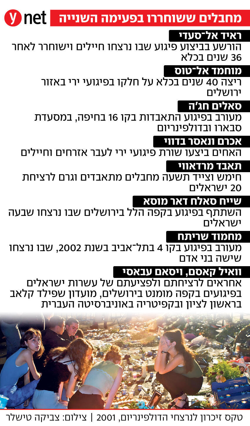שייח' סאלח דאר מוסא, שהשתייך לאחים המוסלמים ולאחר מכן לחמאס, הוא ממחבלי הפיגוע בקפה הלל בירושלים שבו נרצחו תשעה ישראלים ונפצעו עשרות. בנוסף שוחרר מחמוד שריתח שהיה מעורב בביצוע פיגוע ההתאבדות באוטובוס קו 4 ברחוב אלנבי בתל-אביב בשנת 2002, שבו נרצחו שישה בני אדם. הוא נשפט אז לשבעה מאסרים עולם.