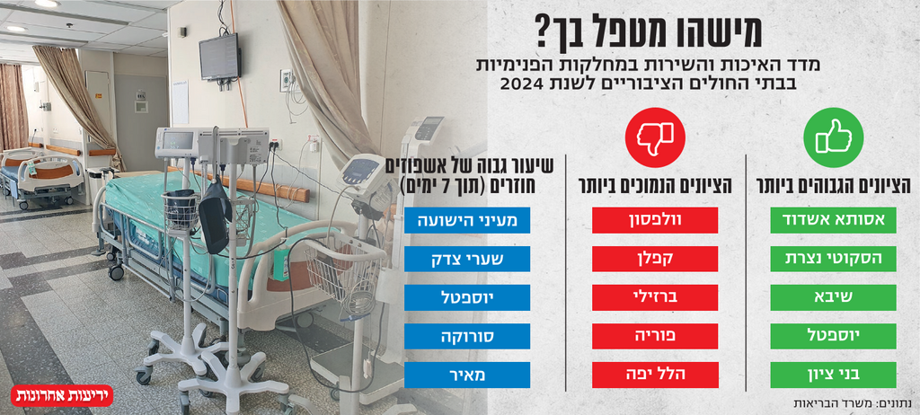 מדד האיכות והשירות במחלקות הפנימיות בבתי החולים הציבוריים לשנת 2024 מטעם משרד הבריאות חושף פערים גדולים בין המוסדות הרפואיים. אסותא אשדוד זכה בציון המסכם הגבוה ביותר בסקר השירות, ואילו הלל יפה בחדרה דורג אחרון. הנתונים מצביעים על מחסור חריף ברופאים בבתי חולים בפריפריה ובשיעורי אשפוזים חוזרים גבוהים במיוחד במעיני הישועה, בשערי צדק, ביוספטל ובסורוקה.