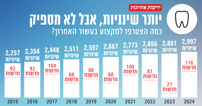ממשרד הבריאות נמסר בתגובה: "חלה עלייה משמעותית במספר השינניות בשנים האחרונות. זמני ההמתנה לבדיקה ולטיפול בתחום בריאות השן עומדים בממוצע על שבועות ספורים".