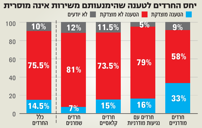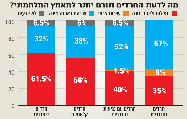 ואכן, הממצאים מטרידים. רוב מוחלט של החרדים לא חושבים שהימנעות מגיוס בשעת מלחמה היא מעשה לא מוסרי, ורובם המוחלט חושבים כי תפילות ולימוד תורה מסייעים יותר למלחמה מפעילות צבאית. רק 8% מקרב החרדים המודרניים (שהם עצמם מיעוט של כ11% בתוך החברה החרדית) חושבים ששירות צבאי מסייע למערכה יותר מתפילות. לצורך השוואה, זוהי לא הגישה בכל מה שקשור לטיפול רפואי. רוב מוחלט של הציבור החרדי לא חושב שתפילה מסייעת יותר מטיפול אצל רופא בשעה של מחלה.