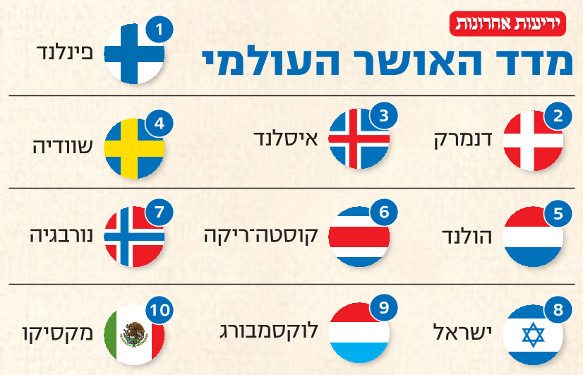 "המדד הזה הוא מדד שביעות רצון מהחיים ומשקף יציבות חברתית מבנית, אבל לא בודק את הרגשות שלנו. הרגשות נמדדים בנפרד, וגם אליהם נתייחס מיד, אבל המדד כשלעצמו מוסבר על ידי שישה פרמטרים: תמ"ג לנפש, תמיכה חברתית, תוחלת חיים, החופש לעשות בחירות בחיים, נדיבות ותפיסת שחיתות".