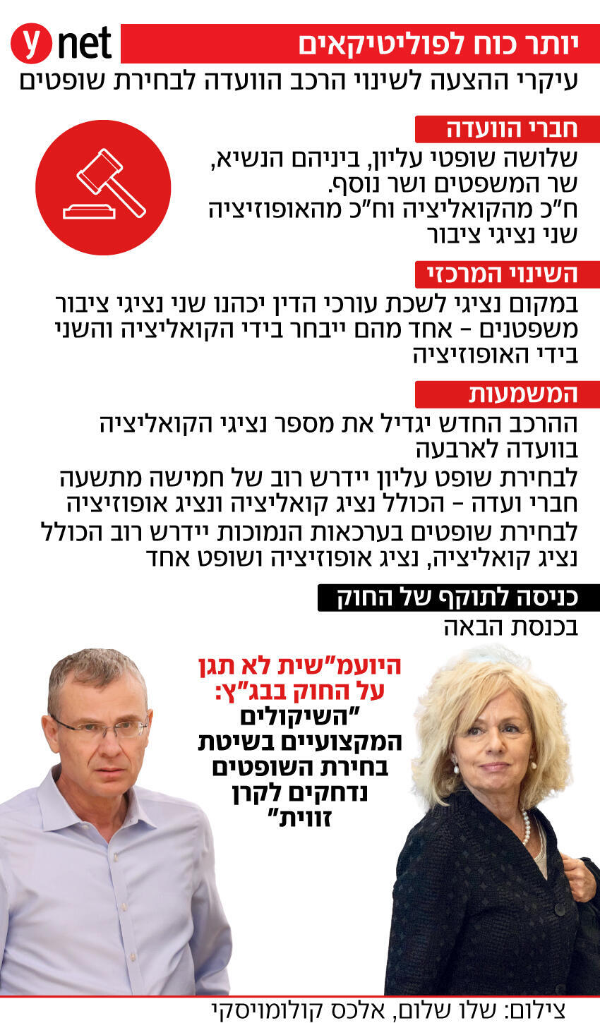 החוק הוא חלק מההצעה שגיבשו שר המשפטים יריב לוין ושר החוץ גדעון סער. הוא ייכנס לתוקף מהכנסת הבאה ולמעשה יעביר לפוליטיקאים, ולקואליציה בפרט, את עיקר ההשפעה על בחירה וקידום שופטים.