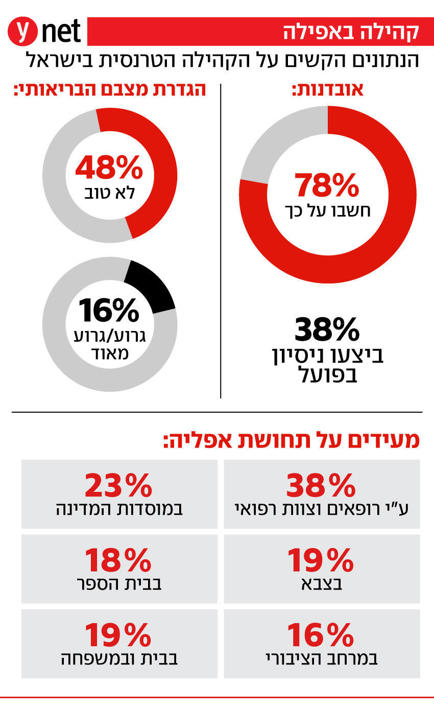 הנתונים המטרידים חושפים את עומק ההדרה, הפחד והייאוש של הקהילה הטרנסית בישראל: 78% מהטרנסיות והטרנסים בישראל מעל גיל 18 חשבו ברצינות על התאבדות. 38% אף ביצעו ניסיון אובדני בפועל.