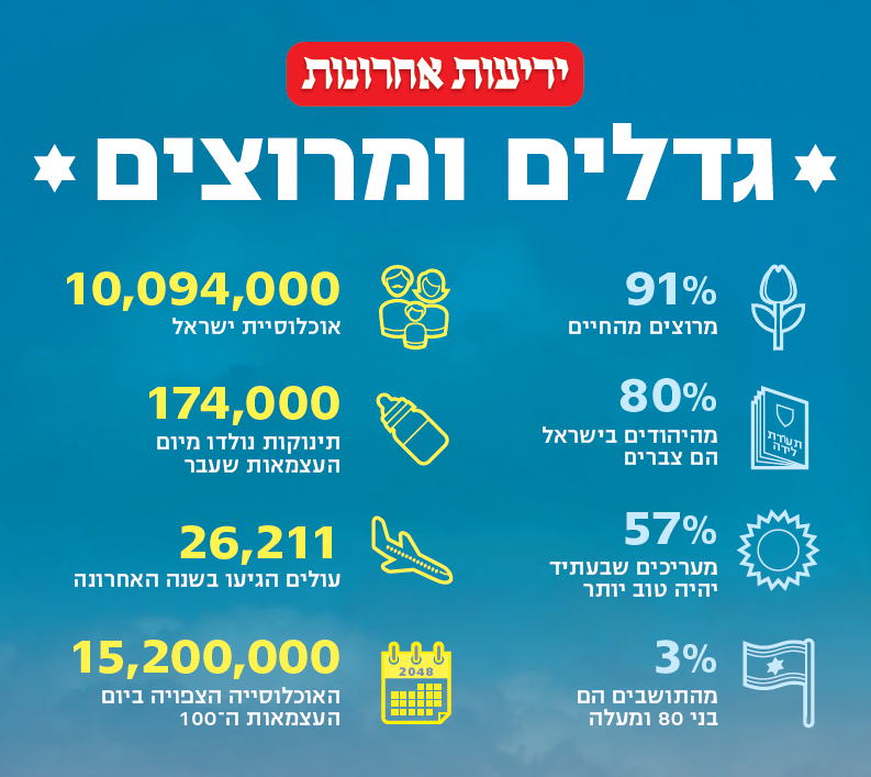ערב יום העצמאות ה-77, מונה אוכלוסיית ישראל 10,094,000 בני אדם. כך עולה מנתוני הלשכה המרכזית לסטטיסטיקה, שהתפרסמו אתמול. בעוד 23 שנים, ביום העצמאות ה-100 של מדינת ישראל, צפויה אוכלוסיית המדינה למנות 15.2 מיליון תושבים.