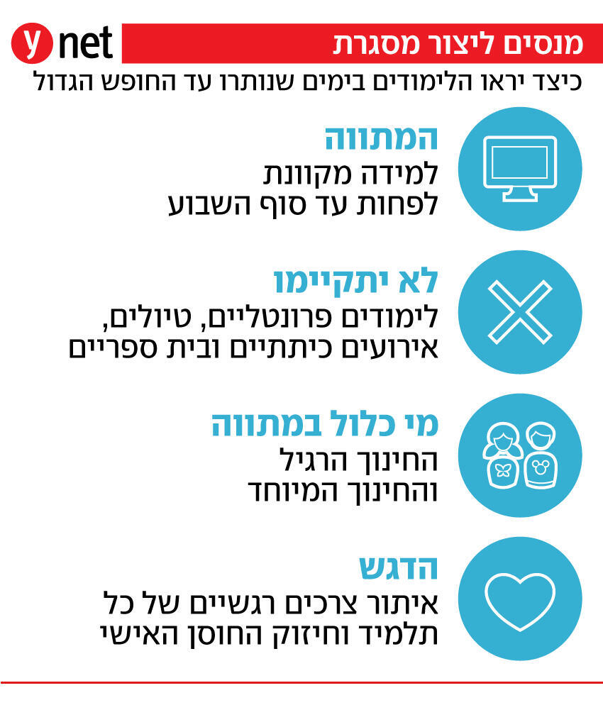 קיש הורה כי הימים הראשונים יוקדשו להתארגנות, לחידוש הקשר האישי בין צוותי ההוראה לתלמידים, לאיתור צרכים רגשיים וחיזוק החוסן האישי של כל תלמיד ותלמידה, ובהמשך ללמידה מרחוק על פי תוכניות הלימודים המאושרות. כיצד זה נראה בפועל? "היה לנו בבוקר זום של 20 דקות שכלל אוורור רגשות", סיפרה אורלי, תושבת באר-שבע ואם לילדה בכיתה ג', "בשאר הזמן יש הרבה טלוויזיה ומנסים לעשות קצת חוברות עבודה. בעיקר מחפשים פתרונות איך לעבוד מהבית. אני חושבת שיש מקום לשעות רבות יותר של שיעורי זום, אבל צריך שיעורים ארוכים יותר. בקיצור, התחלנו בפועל את החופש הגדול מוקדם. יהיה קשה עכשיו למצוא פתרונות לילדים לימים ארוכים".