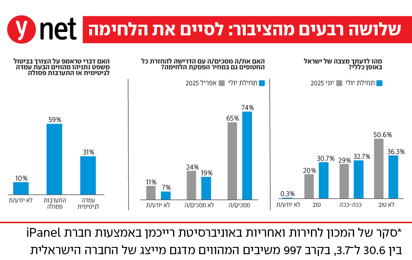 האמת מתחילה להיחשף /מדוע ראש הממשלה מתעקש כל כך על עסקה בשני מהלכים? מדוע אינו מעדיף לסיים את המלחמה כרגע? זו שאלה שמתחדדת לאור נתוני הסקר המופיעים בעמודים אלה, של המכון לחירות ואחריות באוניברסיטת רייכמן: הרוב בציבור הישראלי לסיום המלחמה ועסקת חטופים כבר עומד על כמעט 75 אחוז. הוא התחזק אחרי הצלחת המלחמה באיראן.
